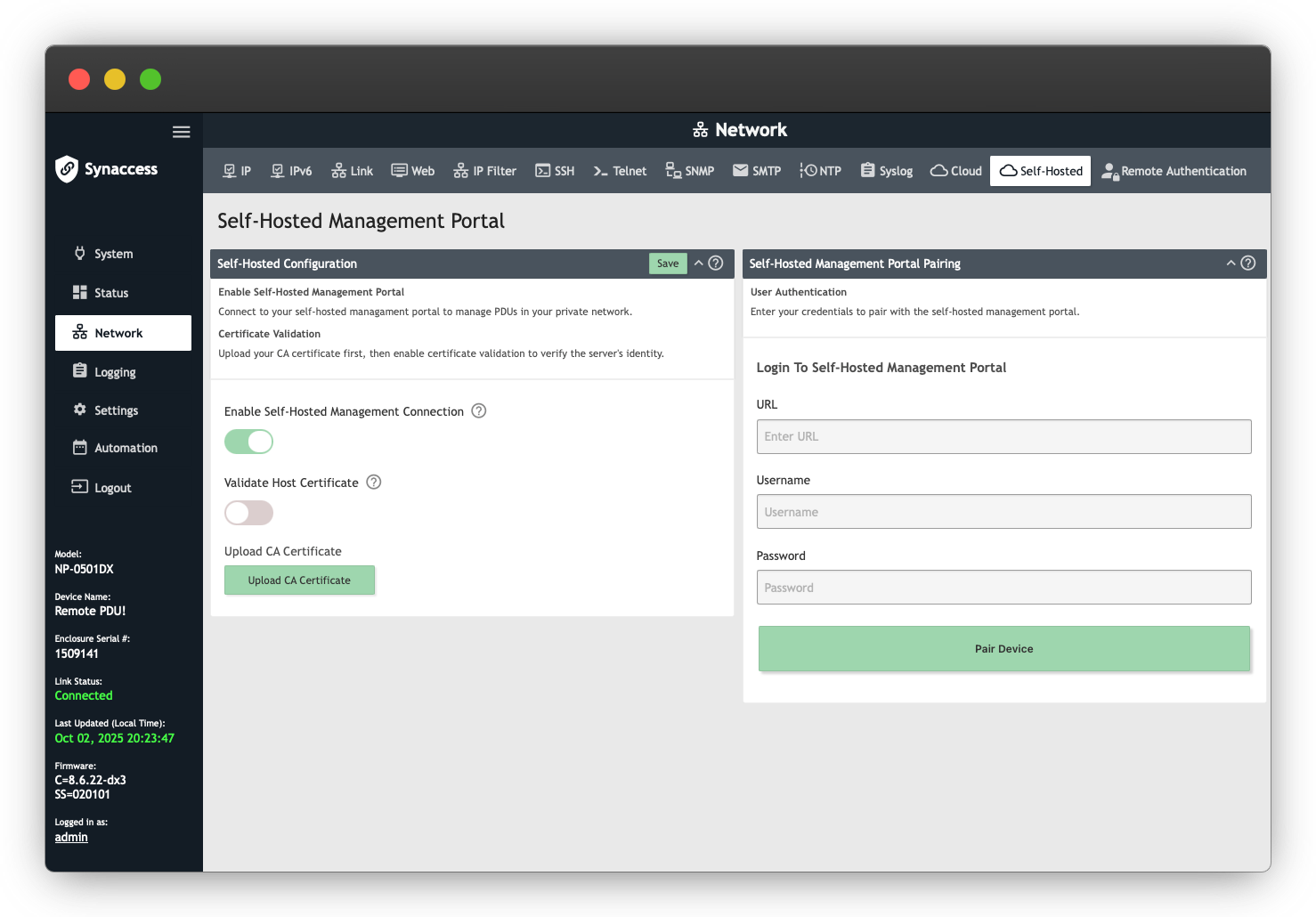 - Log in to the PDU → 2) Network → Self-Hosted → 3) Enable and Save →
