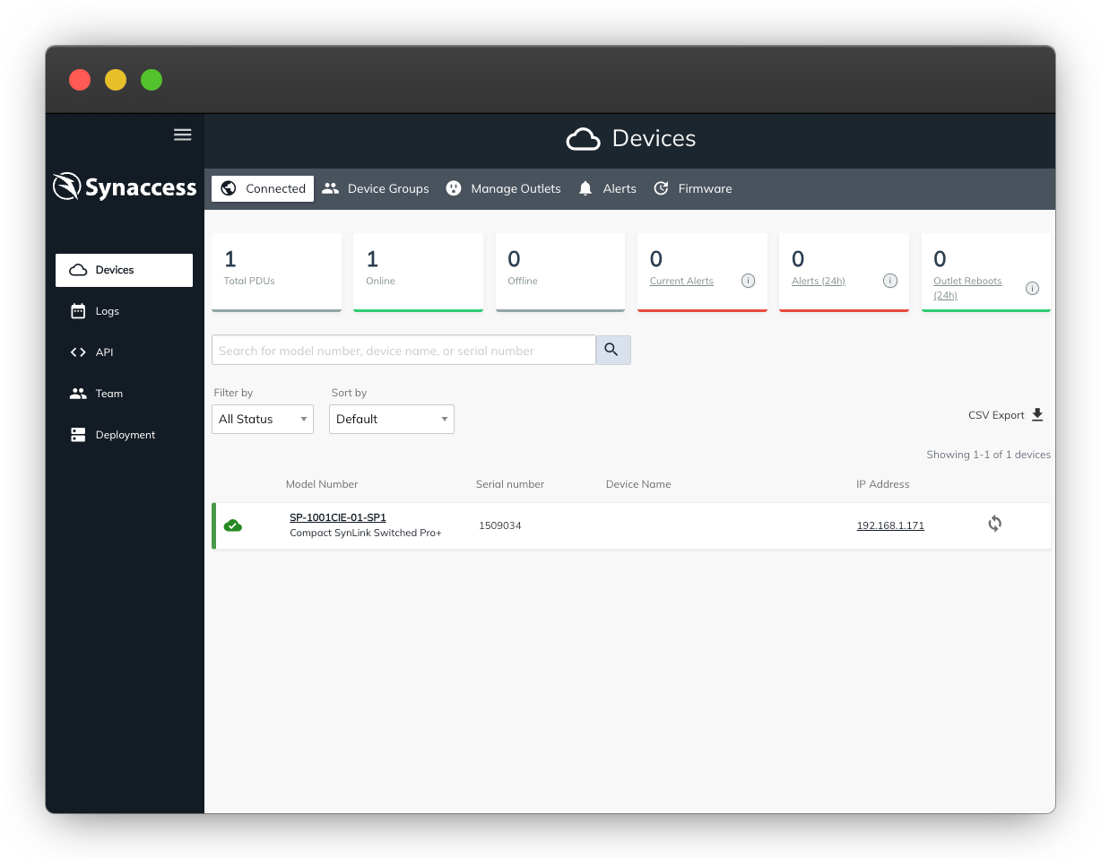 - Sign in to Synaccess CMP → Devices/PDUs. Confirm the PDU appears as online/healthy.