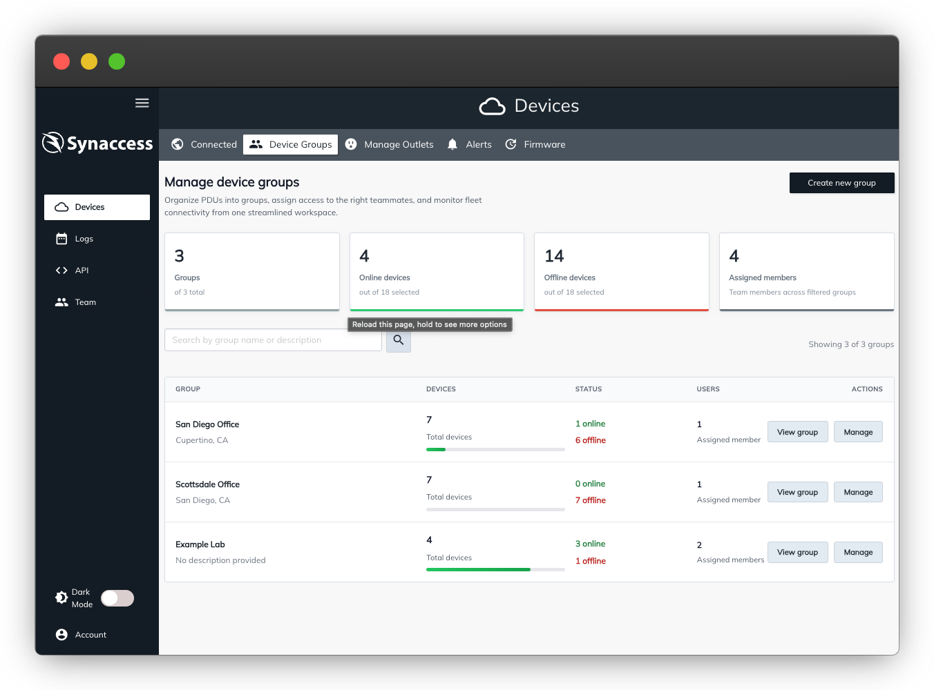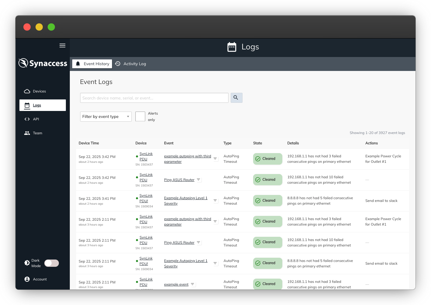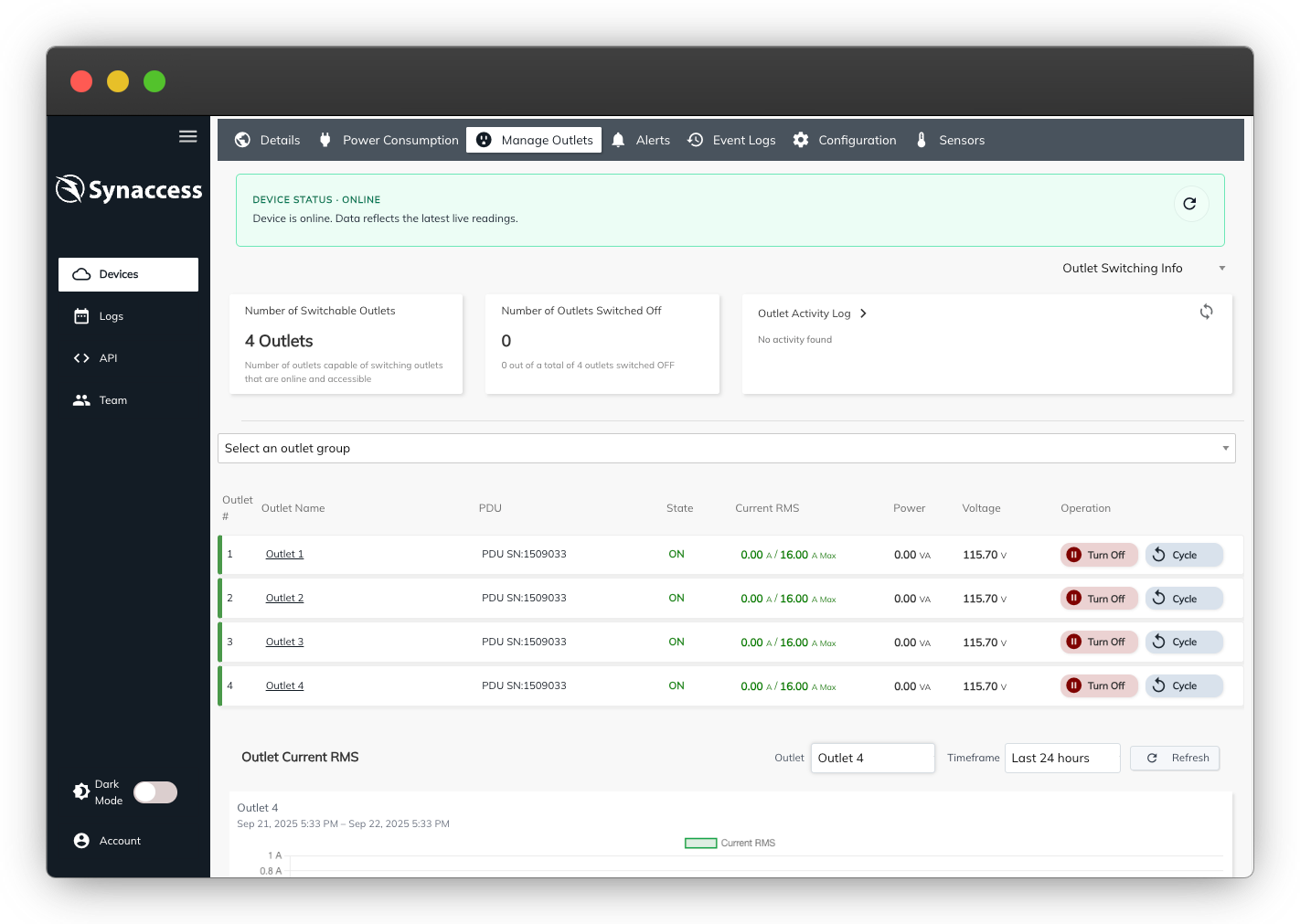 Synaccess Cloud centralizes management for your SynLink PDUs so you can reach devices, command outlets, and keep tabs on every change from a single browser session.