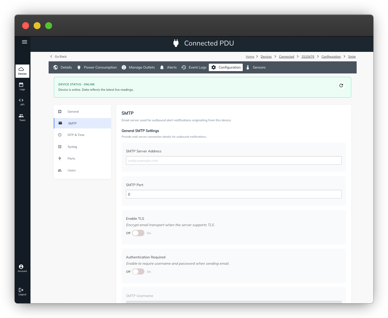 Before the PDU can send emails, you need to configure your SMTP mail server settings for each PDU.