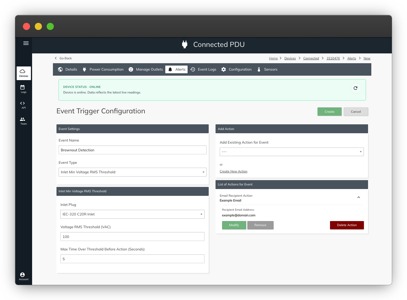 | Inlet Min Voltage RMS Threshold | Detect brownouts (low voltage) | Brownout Detection | Send email |